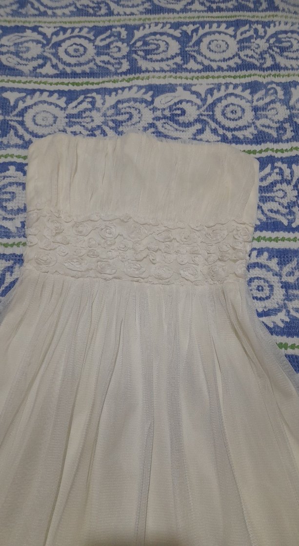 Beyaz straplez elbise, nakış işlemeli ve fırfırlı detaylara sahip, bol kesim ile bohem tarzda, düğün için uygun.