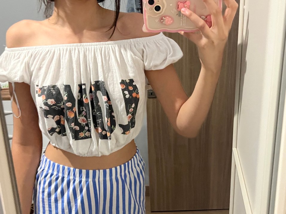Beyaz pamuklu, straplez ve kısa kollu bol kesim bluz. Fırfır detaylı ve batik desenlidir love yazılıdır bi kere giyilmiştir , günlük kullanıma uygundur.