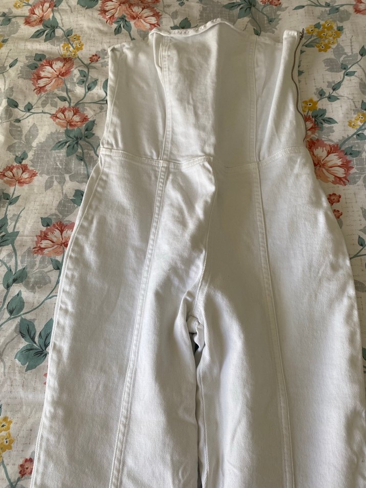 Beyaz pamuklu, straplez ve fermuarlı sırt detaylı, diz boyu, kolsuz, bohem tarzda kadın tulum. Kot tulum