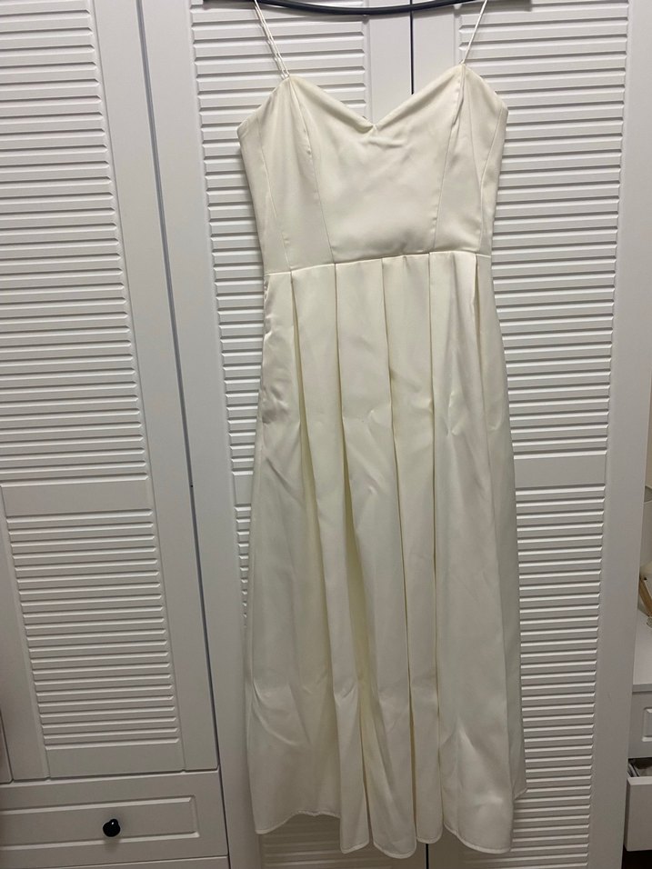 Beyaz straplez uzun elbise, pilili ve bel kısmı vücuda oturan kesime sahip, yumuşak sentetik kumaştan üretilmiştir. İp askılı.