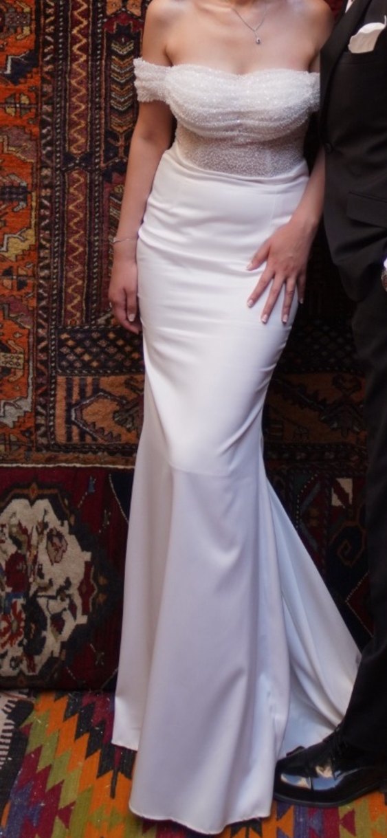 Beyaz straplez prenses kesim gelinlik, uzun boy ve vücuda oturan kesimiyle klasik şıklığı modern tarzla buluşturur. Kolsuz ve gösterişli bir tasarıma sahiptir. Özel dikimdir