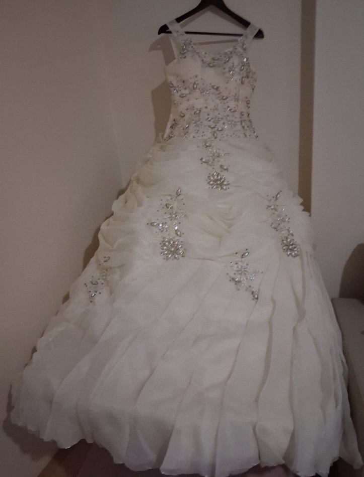 Beyaz straplez prenses gelinlik, işlemeli oturan üst kısmı ve uzun, dökümlü eteğiyle klasik ve gösterişli bir seçim. Kollu olmayan tasarımıyla şık bir tercih.