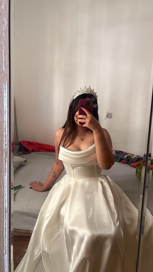 Beyaz straplez prenses gelinlik, oturtma kesim ve askılı kollara sahip, midi boy etek ile klasik zarafeti karşı kültür stiliyle birleştirir. Sadece nikahta giydim arkası bağcıklı bedende zorluk yaşanmaz.