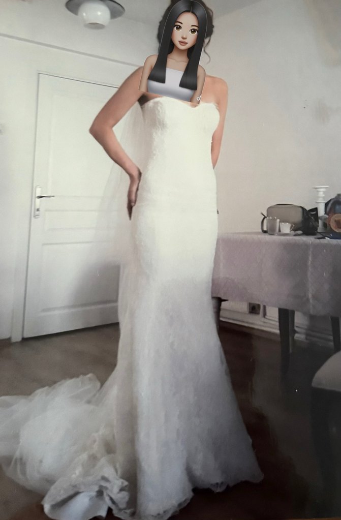 Beyaz straplez, vücuda oturan denizkızı kesim midi gelinlik, minimal ve çağdaş tarzı yansıtan uzun kuyruklu tasarım. Vakko modelidir ünlü modacı Semih doğruerde diktirilmiştir. Tamamen dantel güpurdan 34 beden
