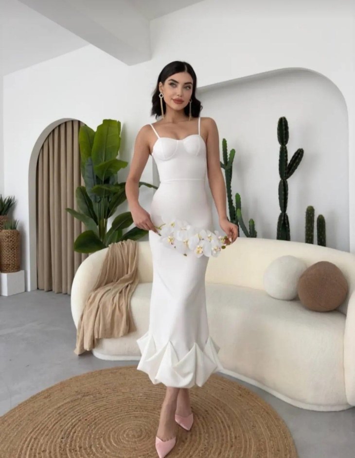 Beyaz, straplez uzun abiye elbise, drapeli detaylar ve ince askılarla tasarlanmıştır. Düğün için minimalist ve şık bir görünüme sahiptir.