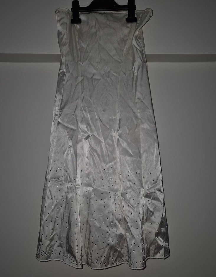 Fitted kesim, straplez ve uzun boy abiye elbise. Etek kısmında taşlı detaylar bulunur. Düğün için uygundur. - Adil Işık (Adl) marka vintage straplez beyaz renk eteği taşlı abiye elbise. Etek kısmı kloş, çan etek gibidir. Üst kısmı straplez ve vücuda oturan biçimdedir. Eteğinin kabarık durması için içine giyilecek eteği tüllü astarı vardır. S bedendir. Kuru temizlemeye uygundur. Dolapta beklediğinden renginde hafif değişimler mevcuttur.