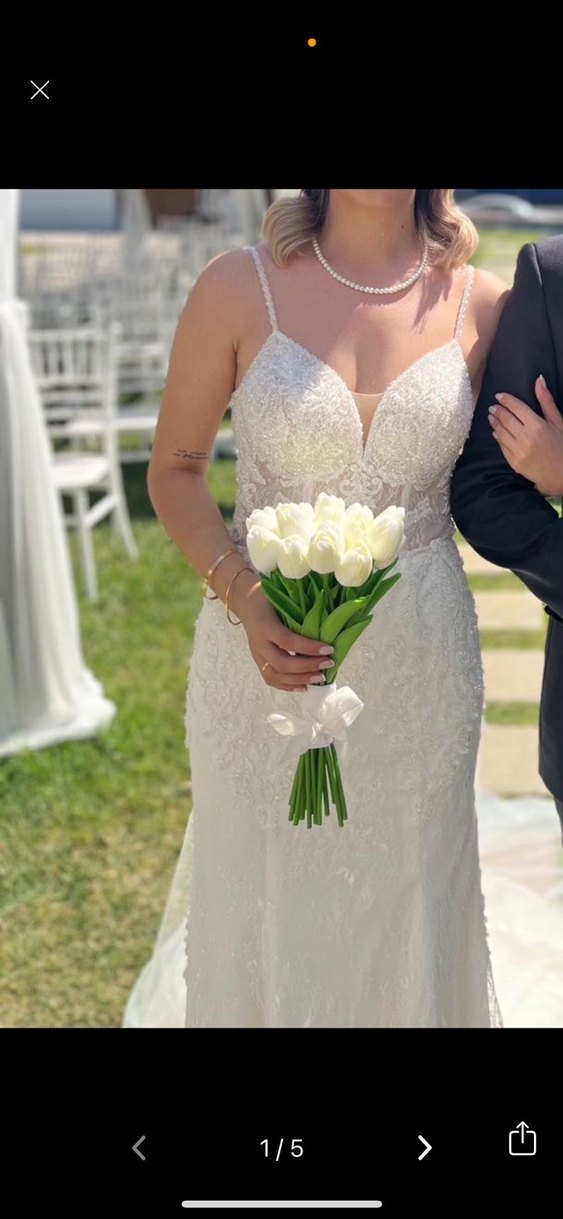 Beyaz renkli, straplez yaka ve ince askılı, vücuda oturan uzun denizkızı gelinlik. Modern klasik tarzda, zarif dantel detaylara sahip.