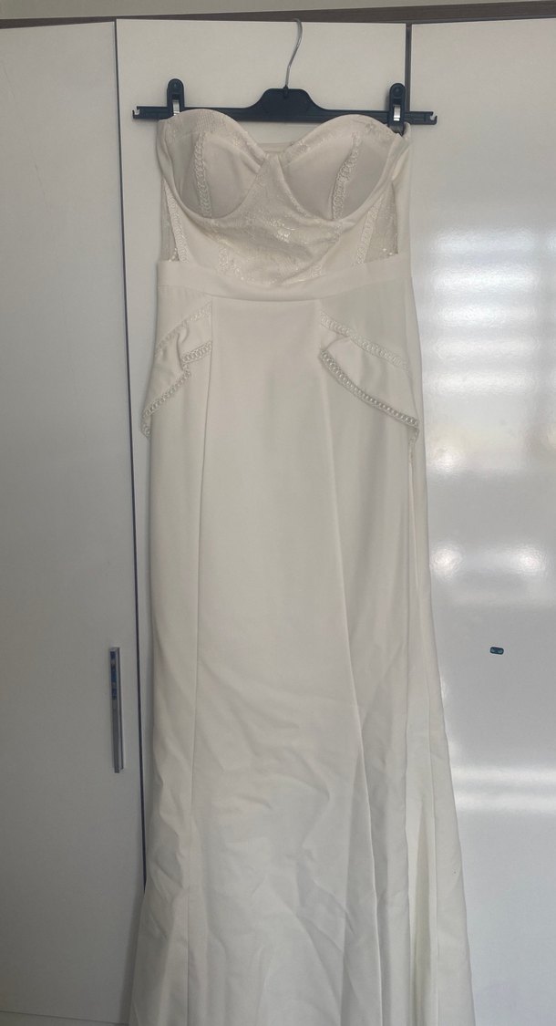 straplez beyaz uzun balık kesim elbise, esnek kumaş.modern klasik tarzda.Düğün,nikah,gelin evden çıkış,Fotoğraf Çekimi için uygun.Trendyol milla dan alındı.1 kere çekim için giyildi,36-38 beden uyumlu,160-165 boy için