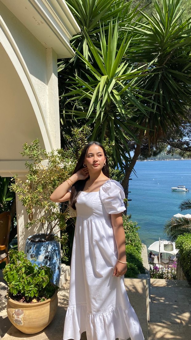 Beyaz uzun elbise, straplez yaka ve askılı kollara sahip. Gevşek kesim, ipeksi dokulu, transparan ve batik desenlidir.