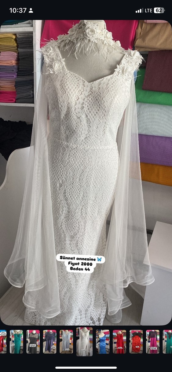 Beyaz, straplez, uzun boy, bohem tarzında gelinlik. Kolsuz ve regular fit kesim. Beden 44, fiyat 2000.