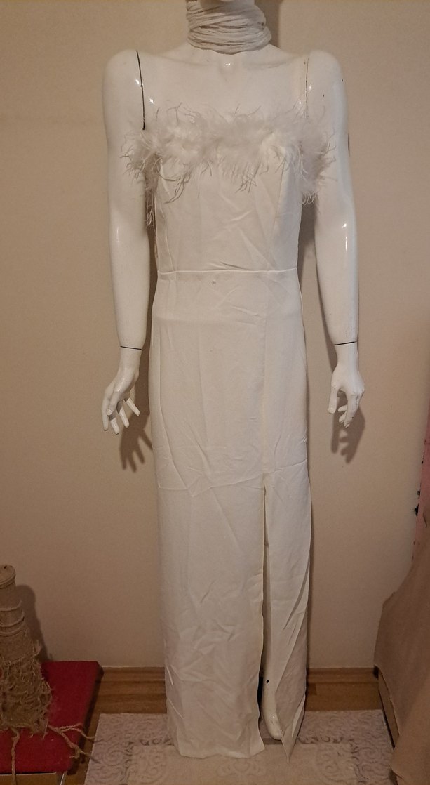Beyaz renkte, straplez uzun elbise, drapeli tasarımı ve göğüs çevresindeki tüy detaylarıyla öne çıkar. Kolsuz ve regular fit kesimlidir, minimal düğün tarzı için uygundur.
