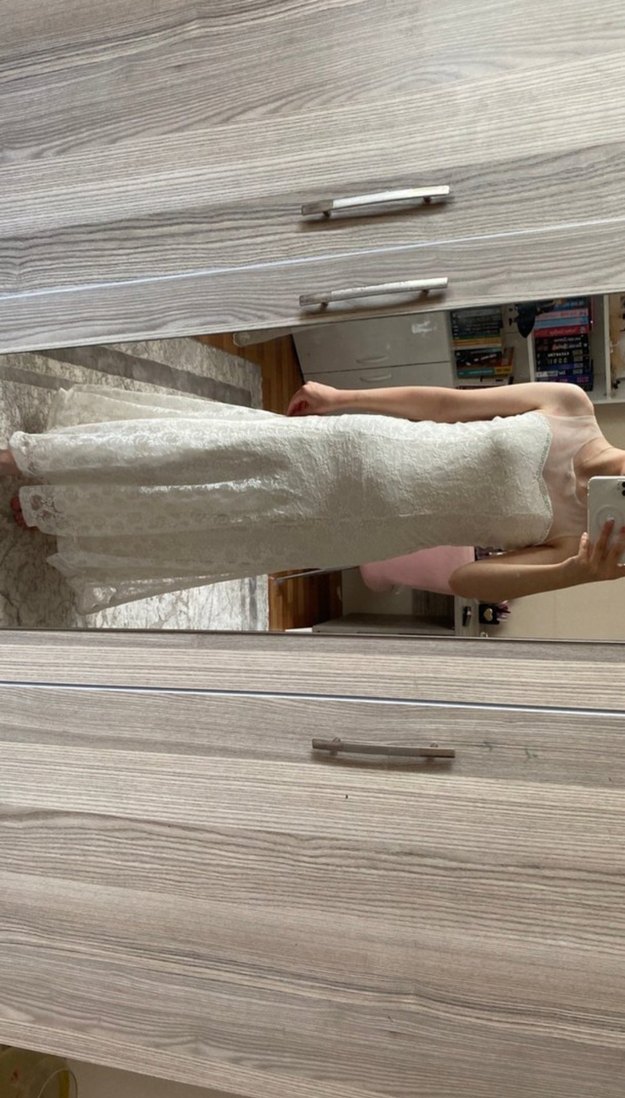Beyaz straplez A-line gelinlik, ince askılı kollar ve vücuda oturan kesimle bohem tarzını yansıtıyor. Hafif ve şık kumaş kullanılmıştır. ♀️