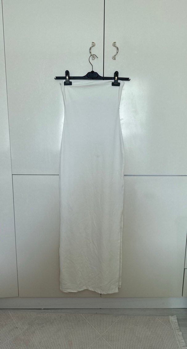 Beyaz straplez uzun elbise, vücuda oturan kesimi ve kolsuz tasarımıyla yumuşak sentetik kumaştan üretilmiştir. Minimalist tarzda rahat ve şık bir görünüm sunar. Lekeleri mevcut, fiyata yansıttım. 0 hiç kullanılmadı, etiketi üstünde.