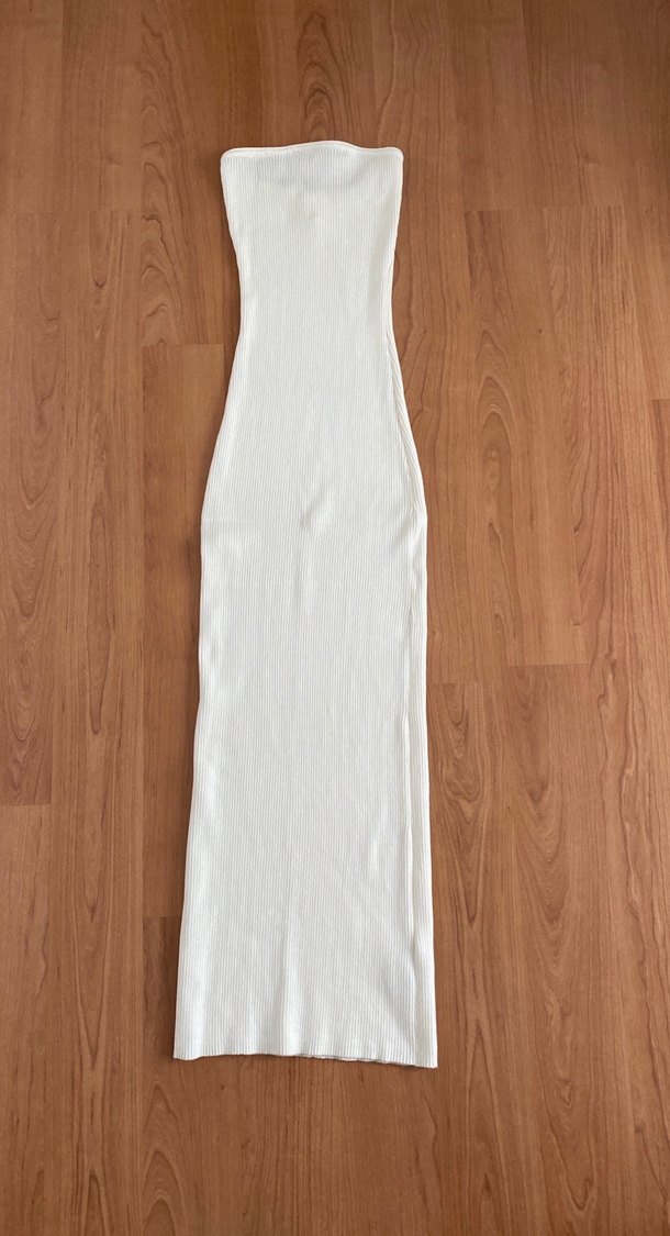 Beyaz, straplez ve vücuda oturan uzun elbise