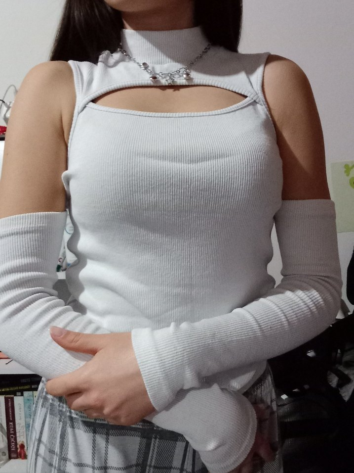 Yumuşak pamuktan üretilmiş, straplez ve uzun kollu beyaz crop top, normal midi boyda, rahat ve şık bir görünüm sağlar.