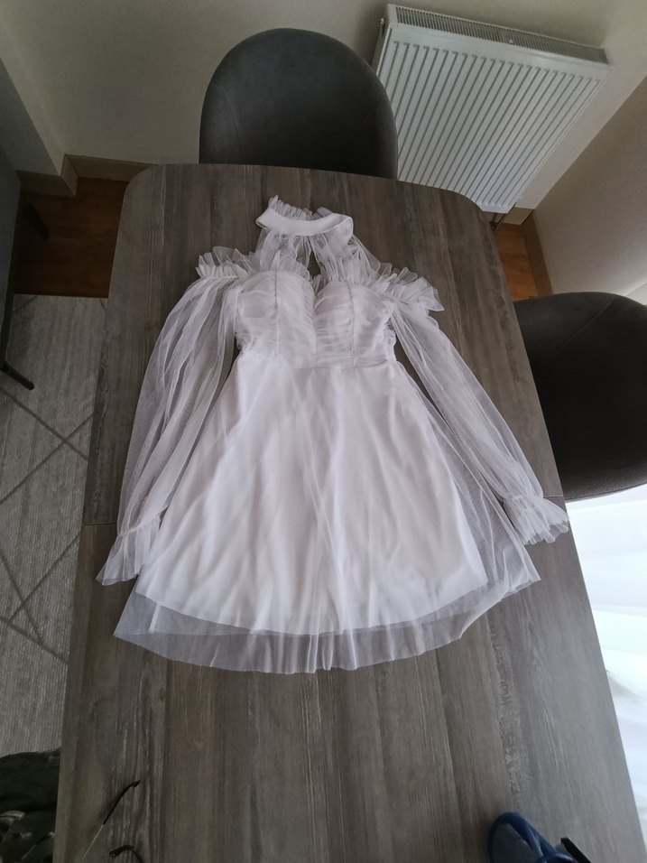 Beyaz Straplez Uzun Kollu Mini Gelinlik/ after party elbisesi