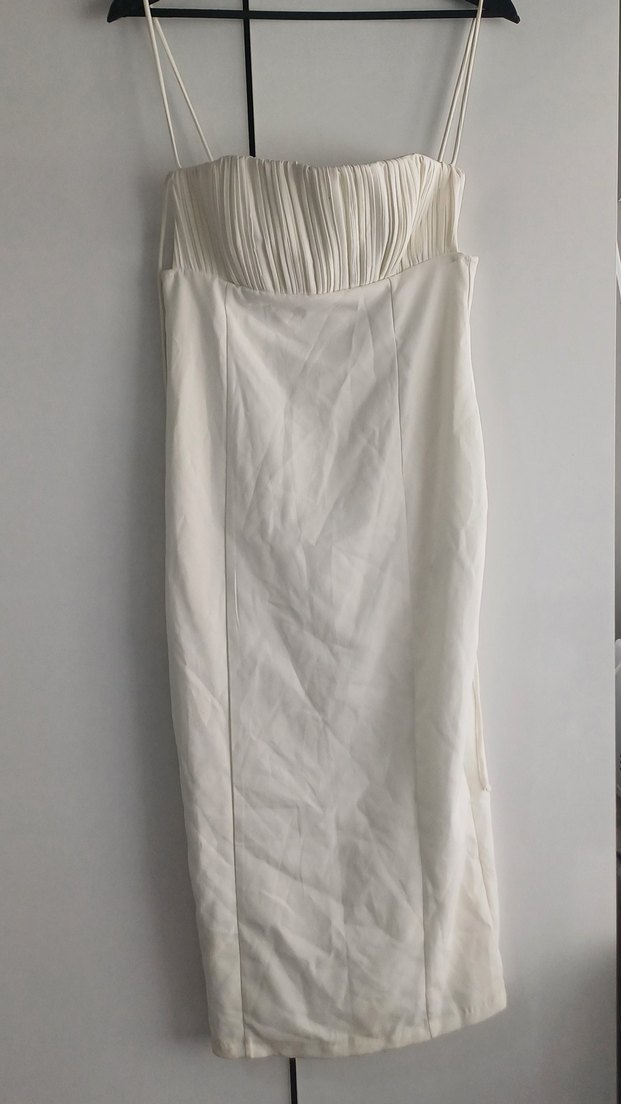 Beyaz straplez uzun nikah elbisesi, oturan kesimi ve pileli üst kısmıyla minimalist ve modern klasik tarzı yansıtıyor.
