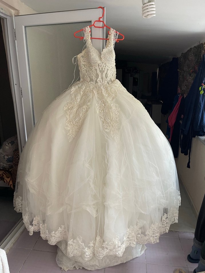 Bu beyaz straplez gelinlik, dantel detaylı oturan bodysu ve uçuşan etek ucu dantel işlemeleriyle klasik ve vintage prenses tarzını birleştirir.