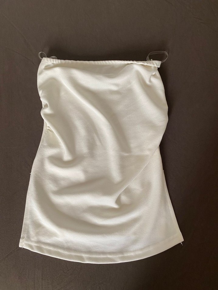 Desensiz, beyaz straplez, hafif kumaştan yapılmıştır ve dışarıda kullanıma uygundur.