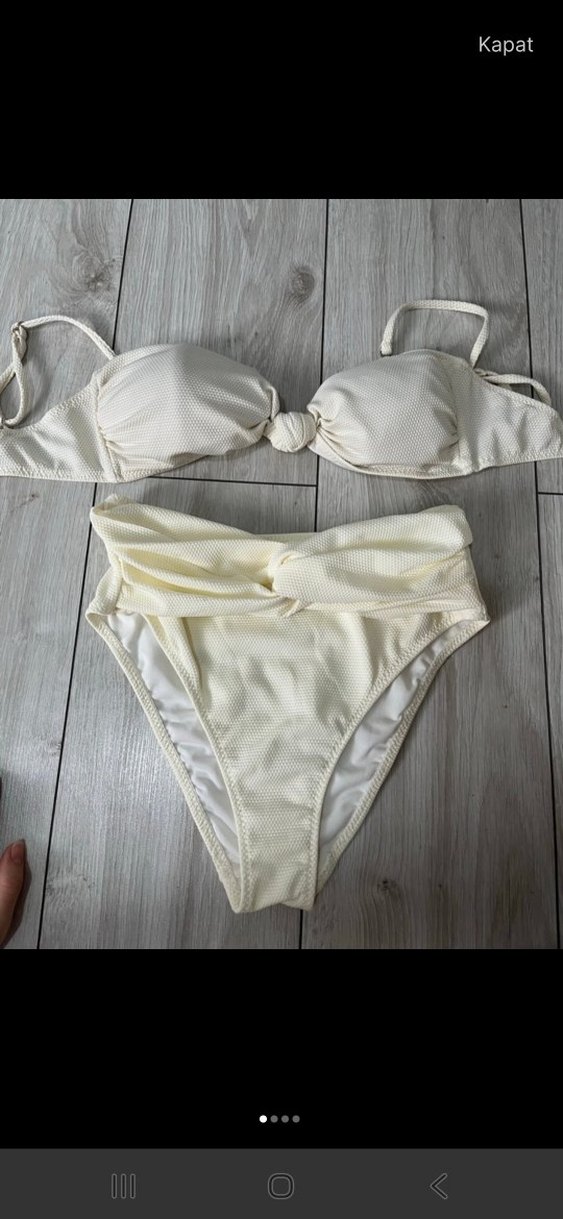Beyaz renkli, strappy askılı ve vücuda oturan bikini takımı. Düğüm detaylı üst ve midi boy alt ile sade, bohem tarzda plaj şıklığı sunar. ️