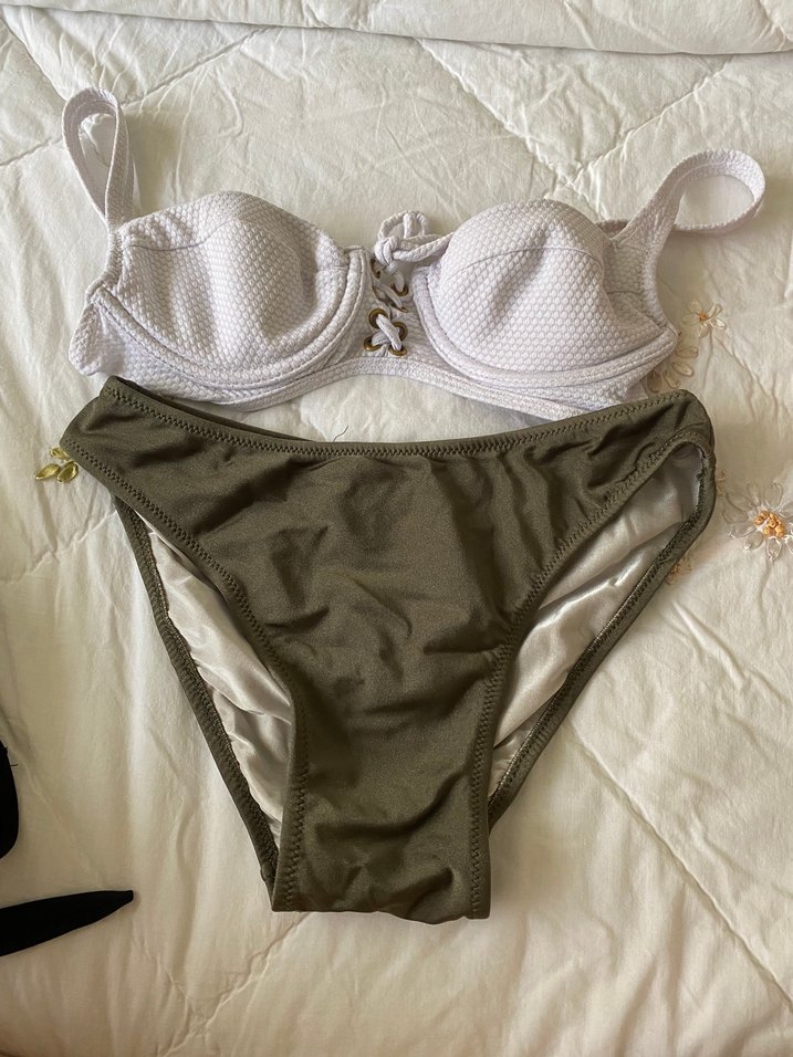 Doku detaylı beyaz strappy bikini üstü, ön kısmı bağcıklı, haki renkte midi bikini altıyla tamamlanmıştır. Bohem tarzda, rahat ve şık bir seçim. İki şekilde de kombinlenebilir
