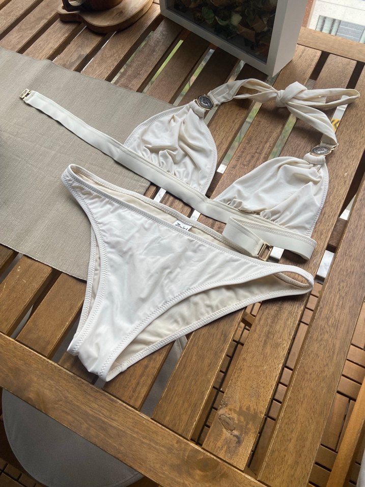 Beyaz, strappy detaylara sahip, minimal ve bohem tarzda, kısa kesim ve fitted tasarımlı bikini. Plaj için zahmetsiz şıklık sunar. ️