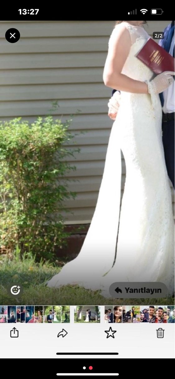 Beyaz renkte,kayık yakalı ve kalın askılı, uzun boylu, klasik ve minimalist tarzda, vücuda oturan denizkızı gelinlik. Sadece nikahımda kullandım tasarım model