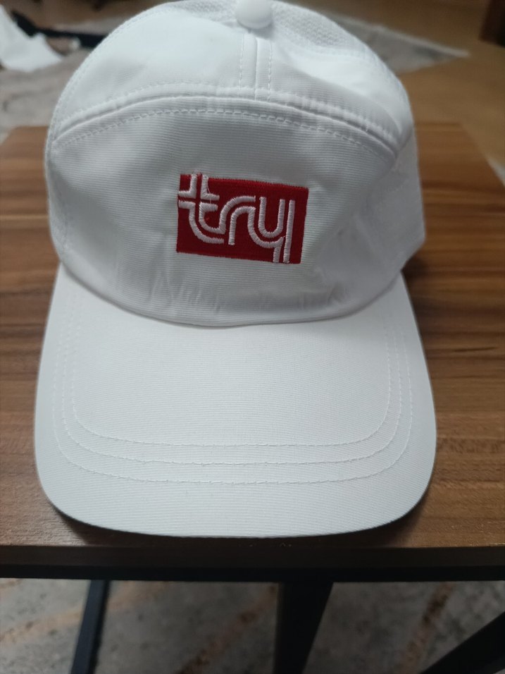 Sentetik kumaştan yapılmış, gri 'tryl' işlemeli beyaz street wear kadın şapka. Velcro ayarlı, trend günlük stil için uygun.