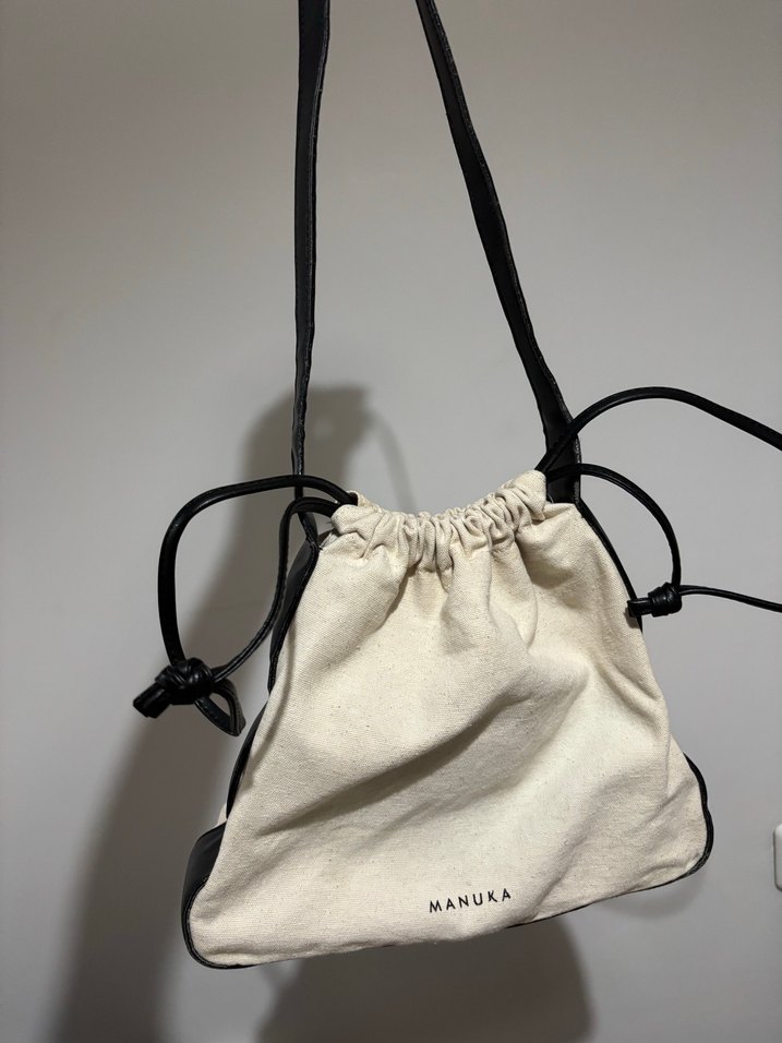 Beyaz keten kadın çanta, minimal baskılı desene ve "MANUKA" yazısına sahip. Normcore tarzıyla zarif ve şık, moda öncülerine uygun.