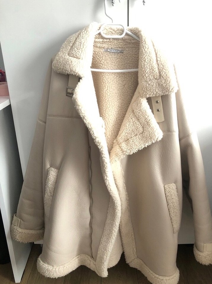 Beyaz süet peluş detaylı, normal uzunlukta, geniş kesim kadın ceket. Notlu yaka ve askılı kollara sahip, günlük kullanıma uygun rahat tarzda. İçi yünlü deri ceket çok sıcak tutuyor standart beden en fazla 5 kez giyildi boydan 70 cm enden 50 cm