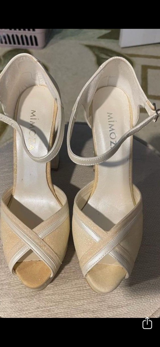 Beyaz süet platform topuklu, tokalı bantlı, minimalist desenli gelınlıkayakkabılar. MIMOZA markasının modern klasik tarzı, düğün gibi özel anlara uygun.