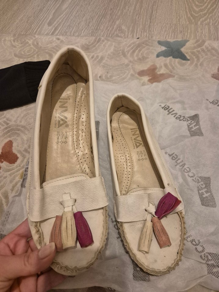 Beyaz süet malzemeden yapılmış, dolgu topuklu ve püsküllü kadın ayakkabısı. Günlük kullanım için uygun, pastel tonlarda ve bohem tarzda.