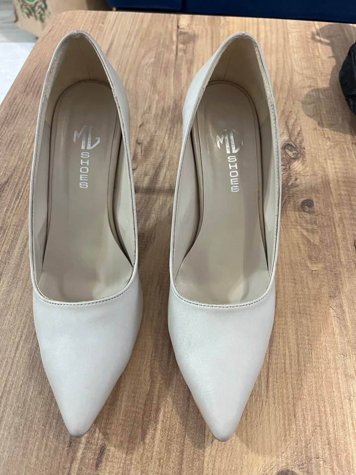 Beyaz süet, sivri burunlu ve klasik tasarımlı stiletto. Düğünler için uygun, minimal ve zahmetsiz şıklık sunar.