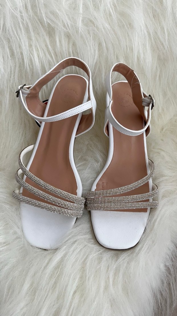 Beyaz süet topuklu sandaletler, tokalı kayış ve minimal taş detayları ile düğünler için uygundur. Hafif renk ve desensiz tasarım sunar.