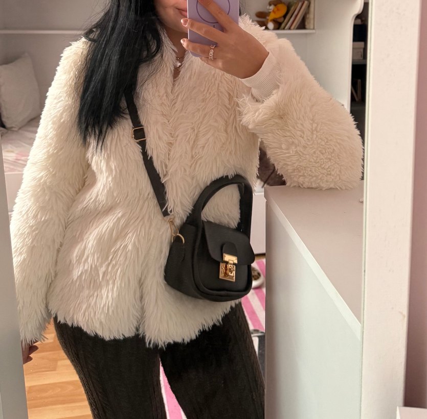 Beyaz deri ceketin üzerinde yumuşak suni kürk detayları ve yüksek yakası bulunur. Strappy kollu, midi boy ve günlük kullanıma uygundur.
