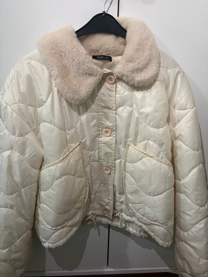 Beyaz renkte, suni kürk detaylı yakaya sahip, bol kesim ve uzun kollu kadın ceketi. Normal boyda, desen içermeyen rahat ve şık bir modeldir.