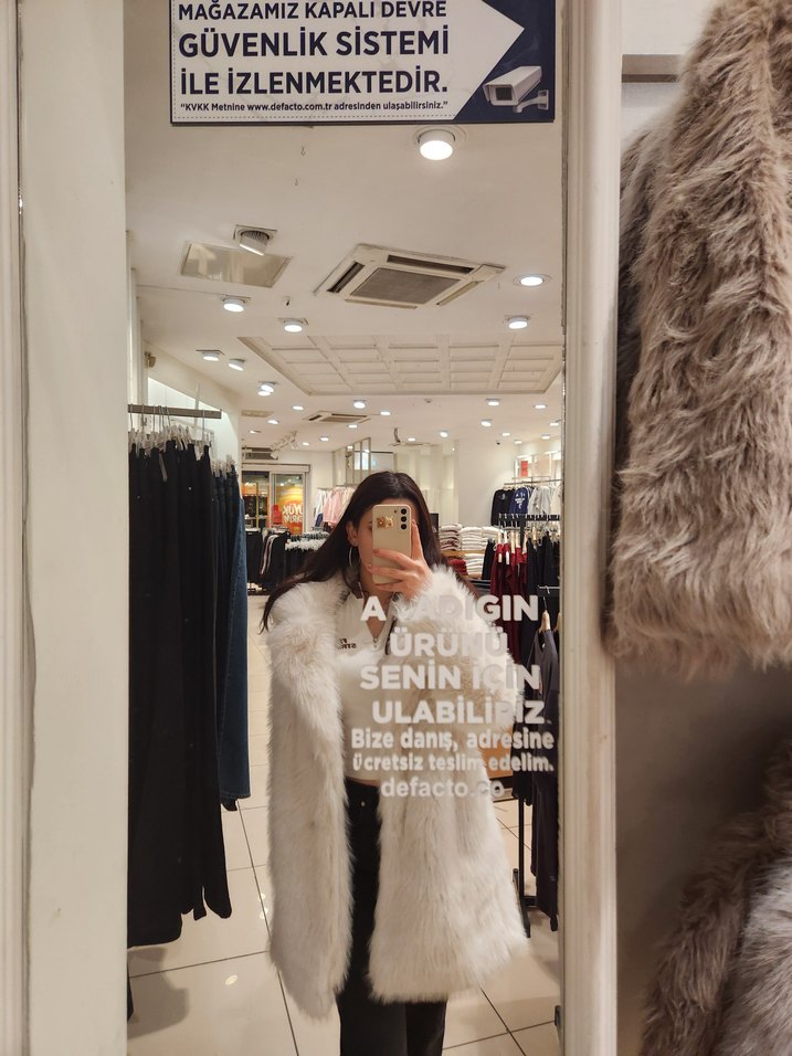 Fitted kesim, midi boy beyaz ceket; uzun kollu, kesik yaka ve suni kürk detaylı, baskılı desene sahip. Paris sokak modasına uygun avant-garde tarzda. çok az giydim kilo aldığım için tam gelmiyor. M beden çok temiz.