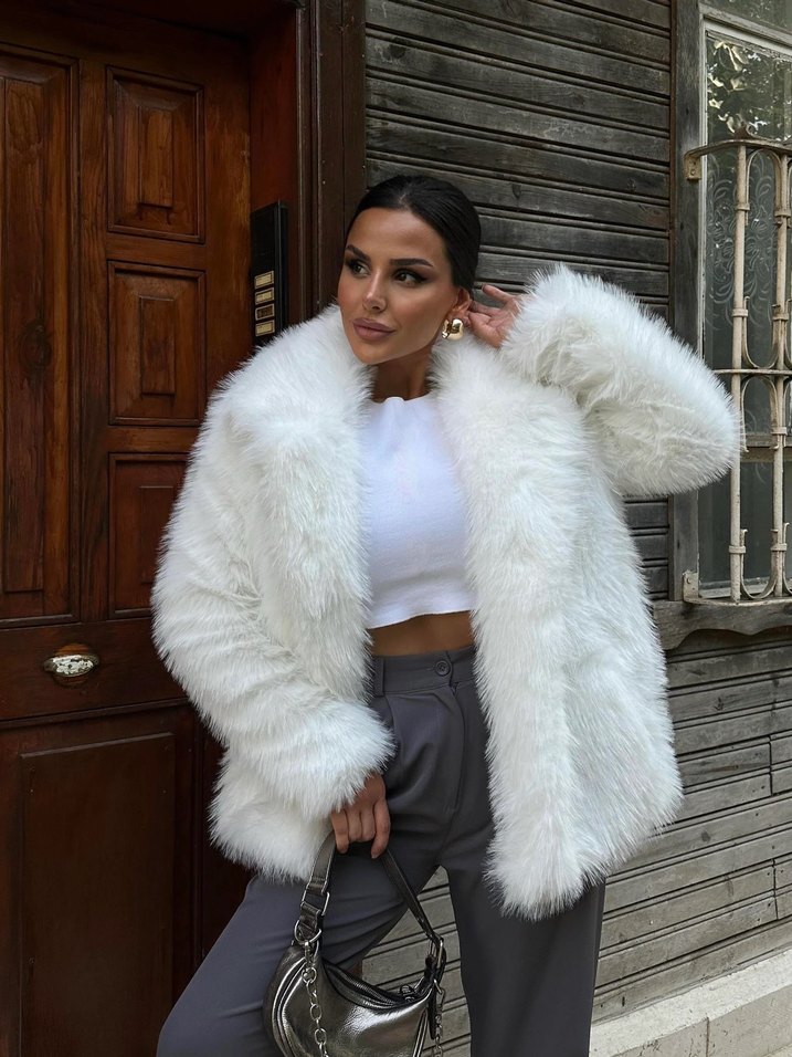Beyaz suni kürk midi ceket, yakalı ve uzun kolludur. Rahat kesimi ve yumuşak sentetik kumaşıyla trend sokak stiline uygundur. Sadece kolunda görünmeyen bi sigara yanığı var 2 ay once 2500 e aldım yanıkdan dolayı fiyat düşük