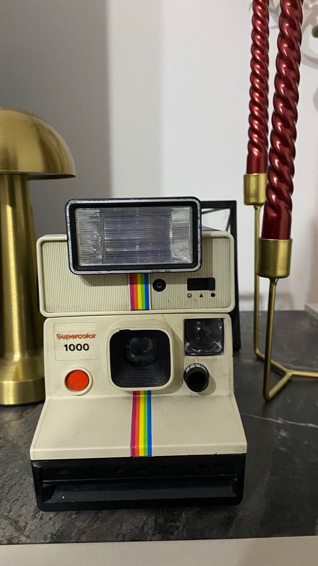 Beyaz Supercolor 1000 filmli kamera, dahili flaş ve renkli şerit tasarımına sahip. Basit kontrollü klasik anında fotoğraf makinesi.