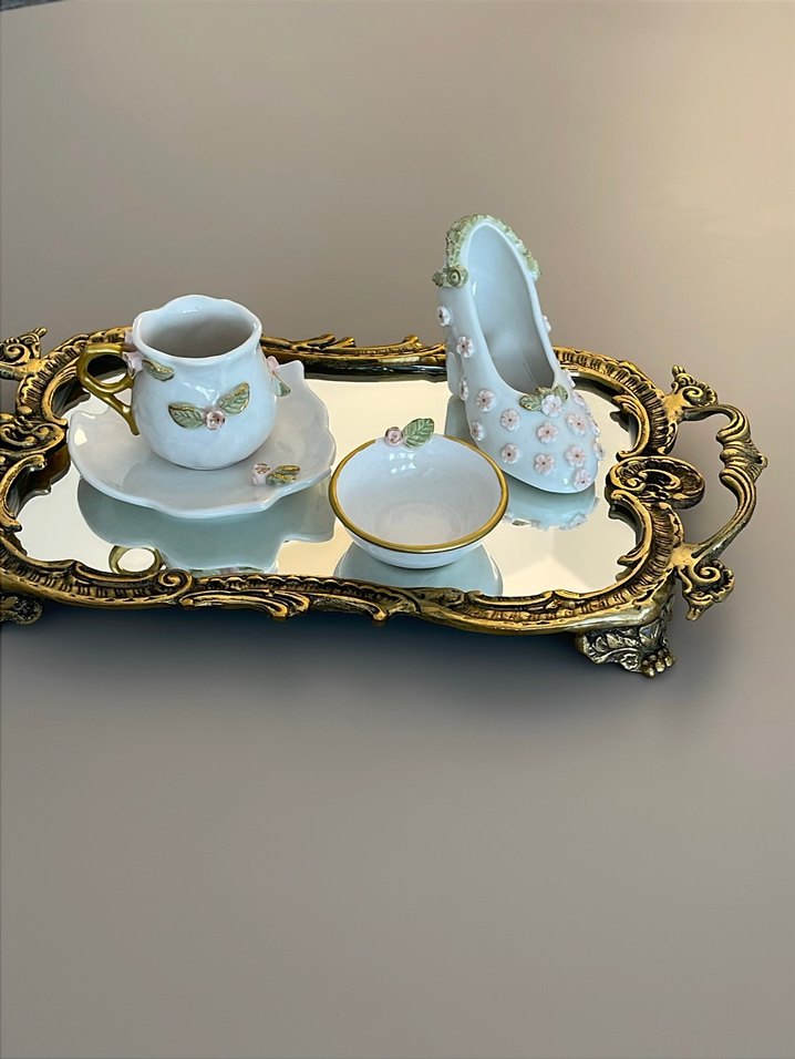 Beyaz fincan ve ayakkabı seti, zarif çiçek ve altın detaylarla süslenmiş, gösterişli altın tepsi üzerinde sergileniyor. ☕