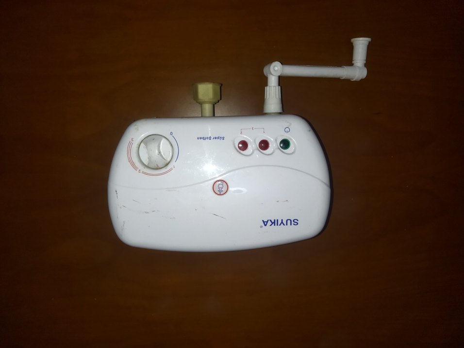Ayarlanabilir sıcaklık kontrolü ve gösterge ışıkları bulunan beyaz Suvika su ısıtıcısı. Kompakt tasarım ev kullanımı için uygun.