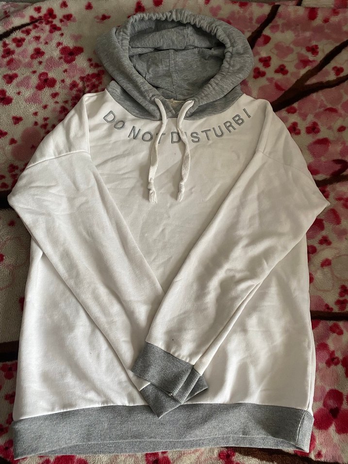 Beyaz sweatshirt. Gri şapkalı uzun kollu. Günlük kullanıma uygundur. Az bir lekesi vardır. Kadın ve erkek için uygundur.