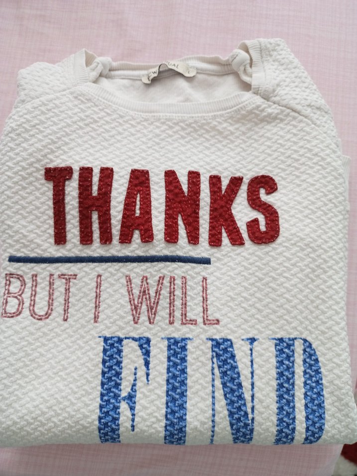 fitted kesim, uzun kollu sweatshirt. "THANKS, BUT I WILL FIND" baskılı, yuvarlak yaka.