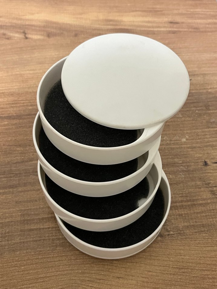 Beyaz renkte, siyah süngerli bölmeleri olan çok katlı takı organizeri.