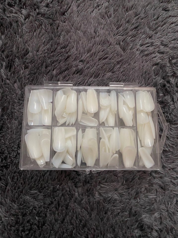 Çeşitli boylarda beyaz takma tırnaklar, şeffaf plastik kutuda düzenlenmiş. Tırnak süsleme için uygun. İçinde kaç tane olduğunu bilmiyorum ama nerdeyse iki kere kullandım