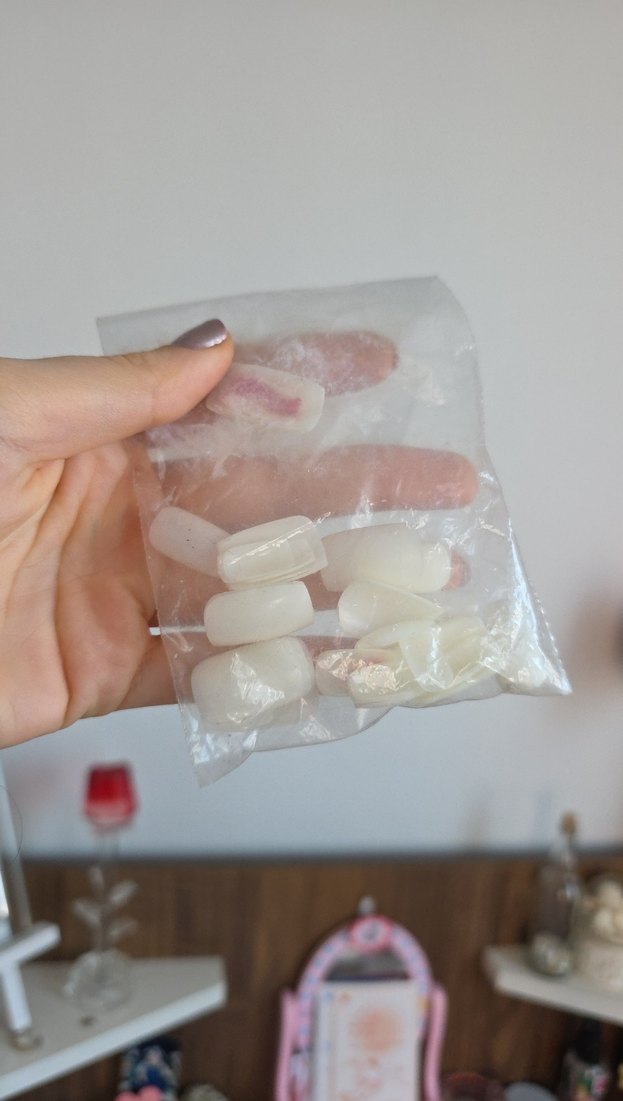 Farklı boylarda, şeffaf poşette paketlenmiş açık beyaz takma tırnak seti.