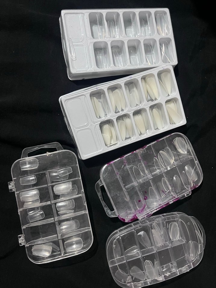 Farklı boyutlarda beyaz takma tırnaklar, şeffaf plastik kutularda düzenli şekilde sunulmuştur.