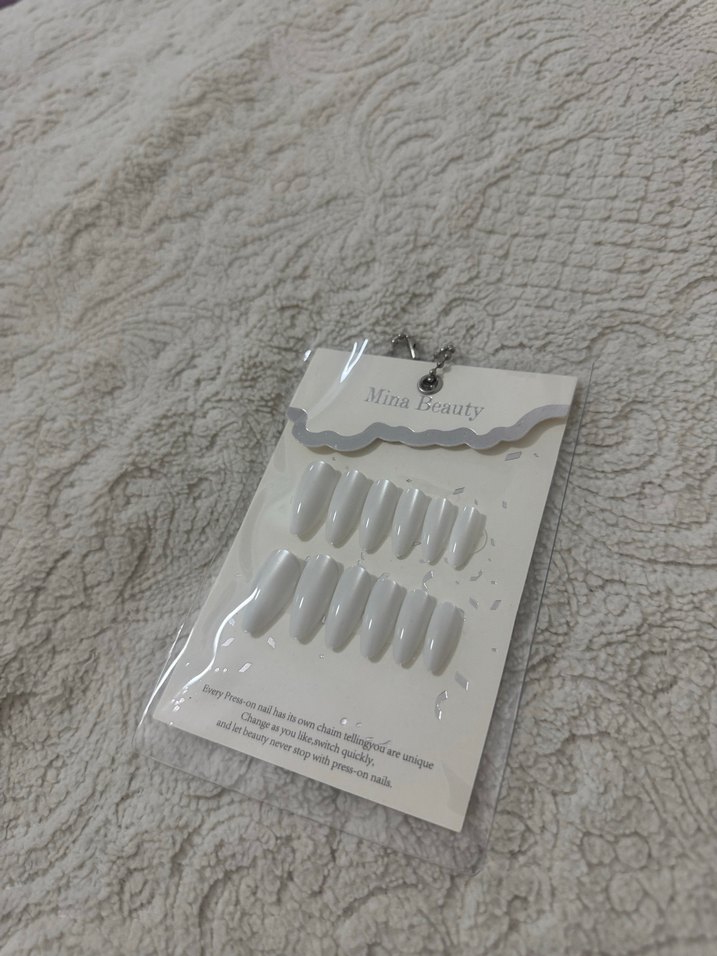 Mina Beauty markalı, kolay uygulanabilen beyaz takma tırnak seti. Düz ve şık görünüm sağlar.