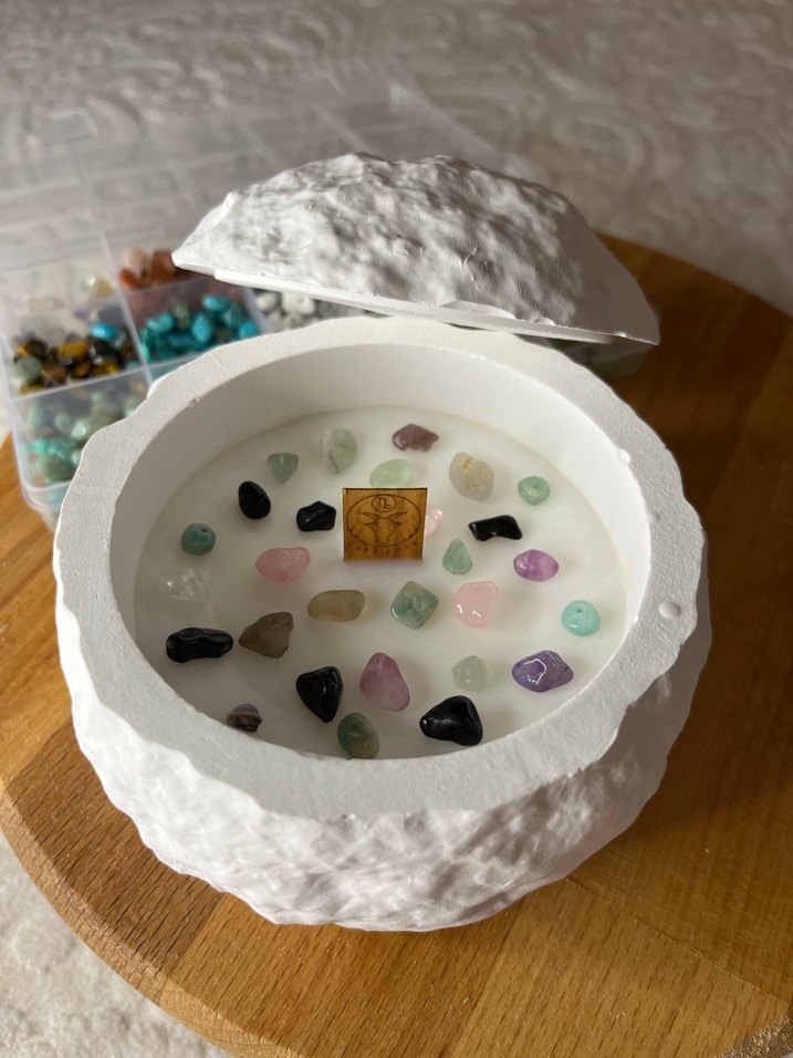 Taş görünümlü beyaz mum kabı içinde renkli küçük taşlar ve ahşap süslemeyle tamamlanmıştır. ️