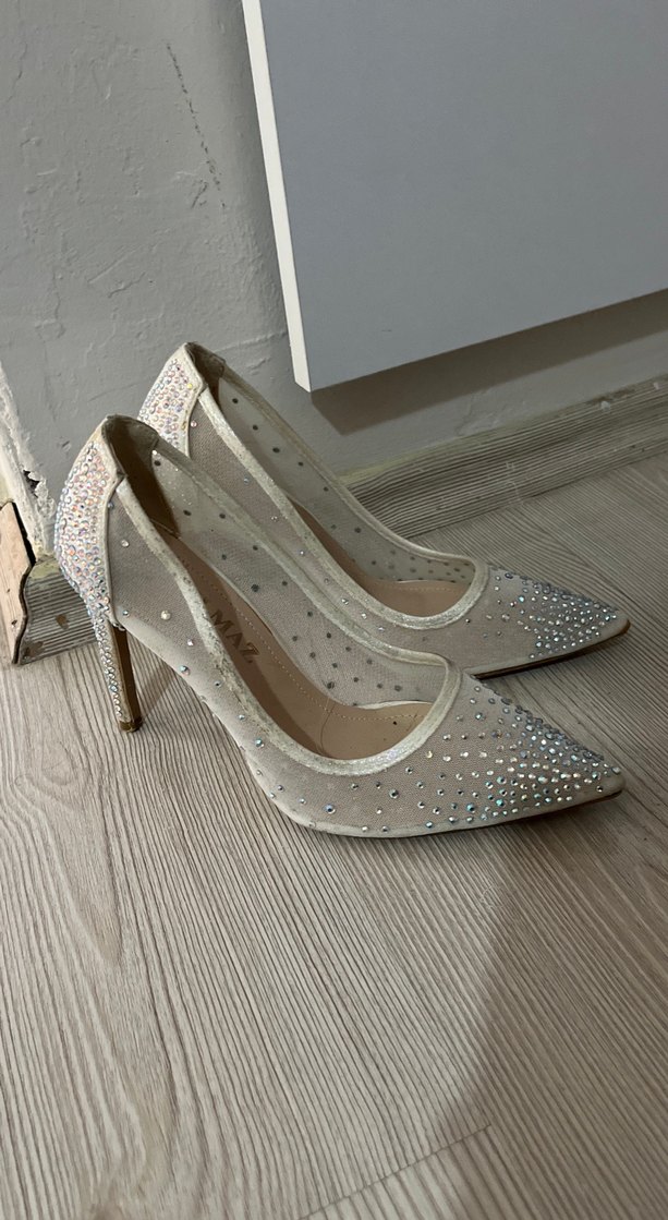 Beyaz renkte, taş işlemeli ve ince topuklu, sentetik kumaştan abiye ayakkabılar, düğünler için uygundur. ✨